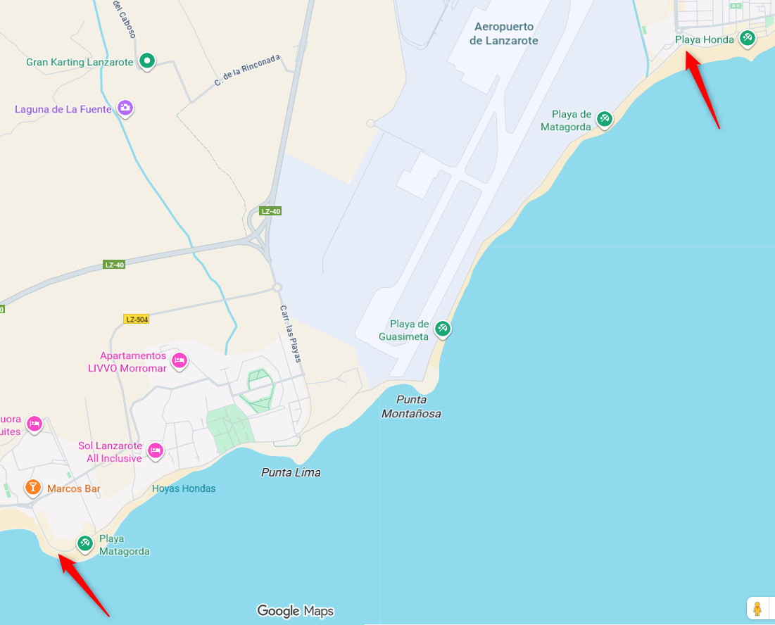 This afternoon I did the northwest walk in reverse: I parked the car in Playa Honda, walked the coastal path past the airport until I reached my old hotel, then turned around and came back the same way. The other big difference from when I lived there is that in winter I usually finished work almost at dusk, so the walk home was in complete darkness (back then the airport had no night flights and they switched off all the lights). I loved hearing nothing but the sea in the pitch-black night.